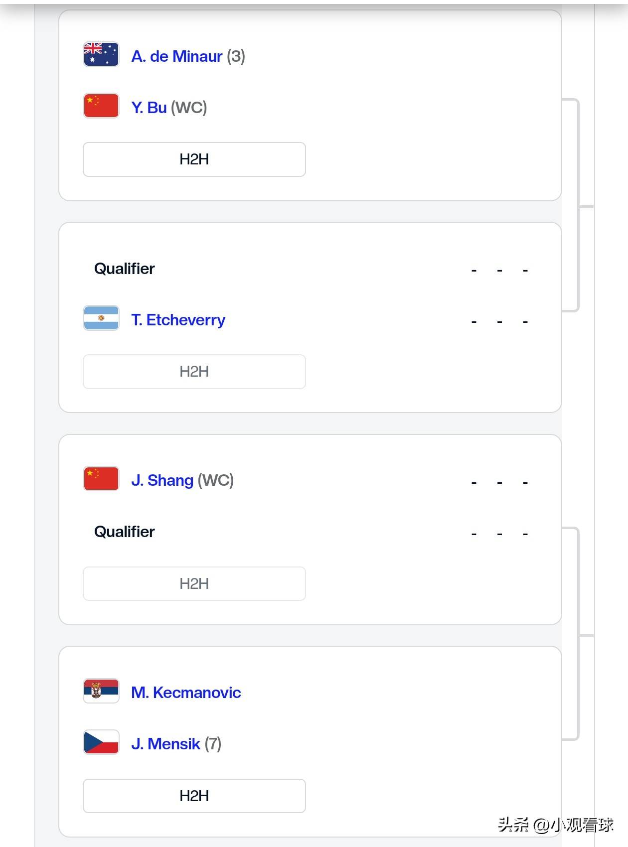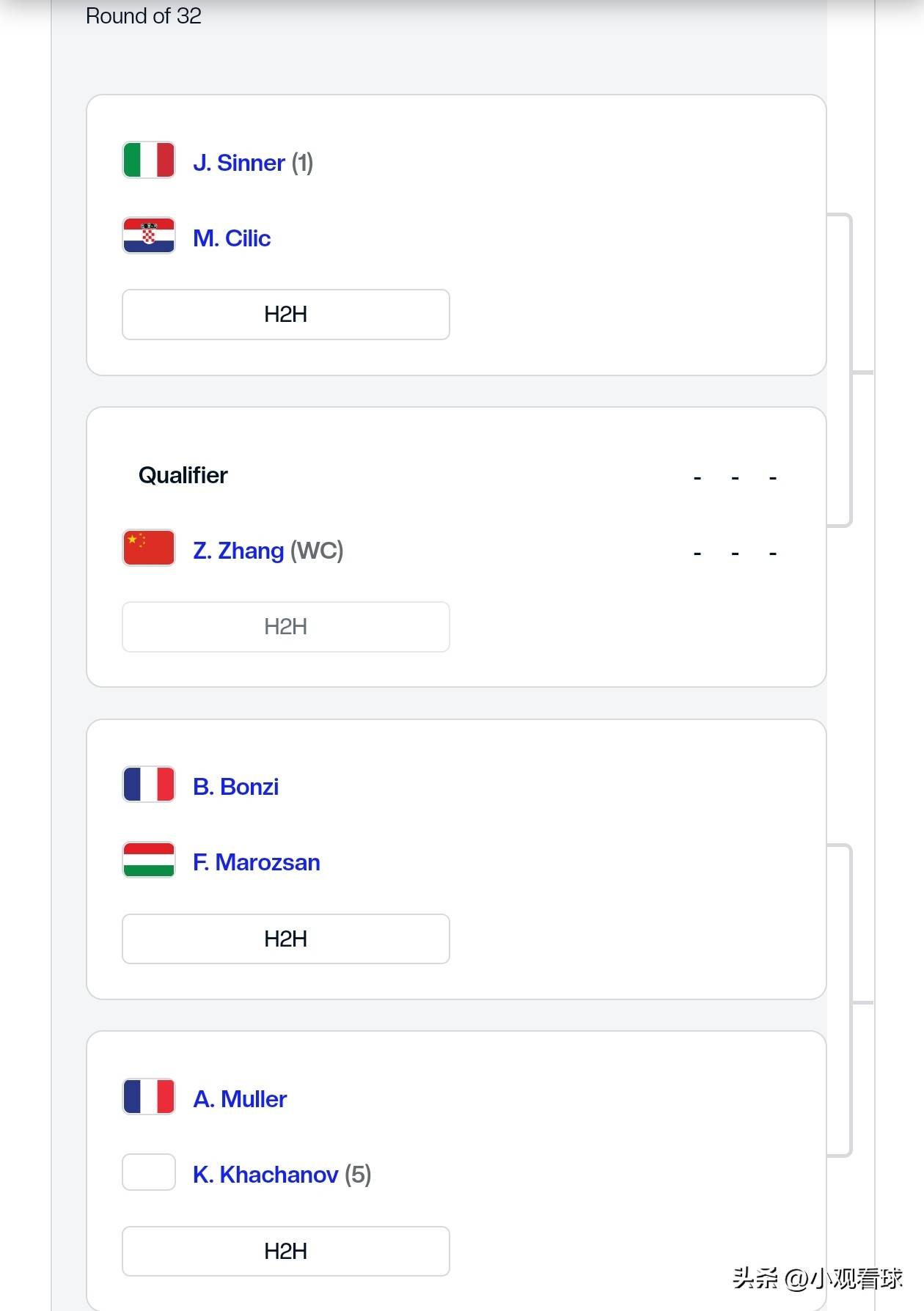 张之臻首轮对阵资格赛选手,算是上上签。对手是戈芬,阿特马纳,卡佐,马纳里诺中的一位。希望碰到的是老马吧。