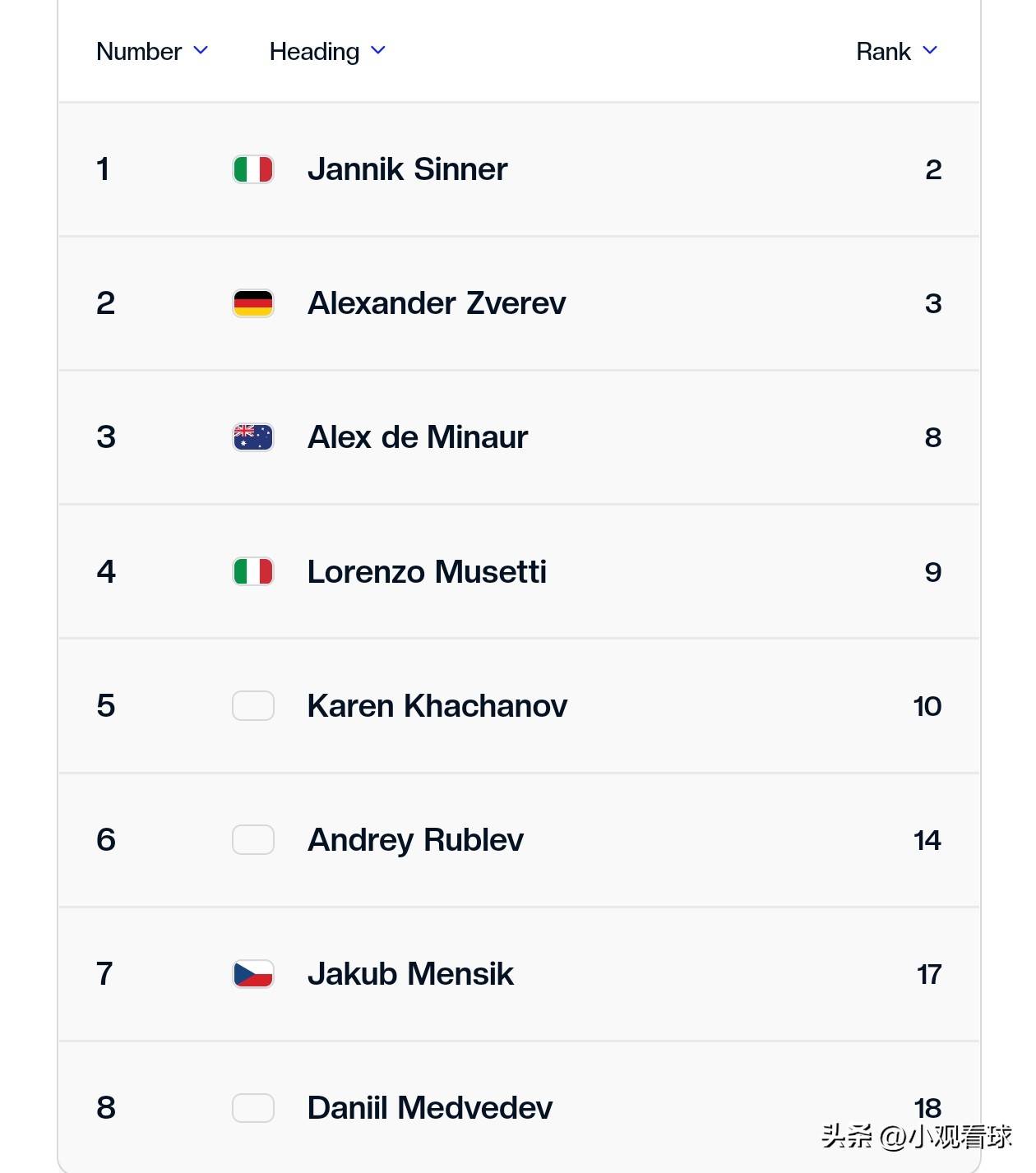 2025-10-20中国网球公开赛,中网2025,China Open网球,中网赛程,中网签表,中网直播/全面聚焦2025中国网球公开赛(China Open)赛程、签表、比分直播、冠军赔率及选手动态,打造中文网球资讯首选平台。ATP500中国公开赛蓄势待发。八位种子中有四位TOP10选手:辛纳,兹维列夫,德米纳尔和穆塞蒂。还有3位前TOP10选手:卡恰诺夫,卢布列夫和梅德韦杰夫。这个阵容比同期开始的东京500赛阵容还是强大不少。那边的八位种子选手是阿尔卡拉斯,弗里茨,鲁内,鲁德,马哈奇,安贝尔,沙波瓦洛夫和蒂亚福。只有阿尔卡拉斯和弗里茨两位TOP10选手。