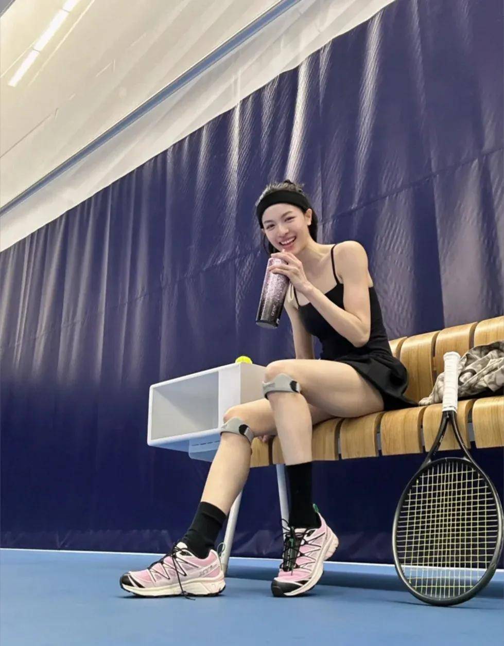 我们在过中秋节的时候钟楚曦在打网球,她上身了alo的网球裙,Sandy Liang × SALOMON的联名鞋,一旁的瑜伽包也来自alo,球拍同样来自Wilson威尔胜,钟姐假期也在卷。
