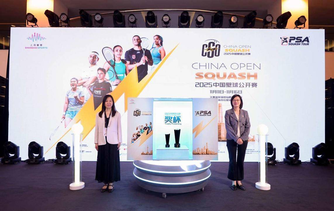 活动现场,上海久事体育产业发展(集团)有限公司总经理章华群与上海市长宁区体育局副局长刘莉一同揭晓了2025中国壁球公开赛奖杯。这尊承载着赛事荣誉的奖杯,将凌厉的闪电元素与上海的城市剪影巧妙融合,象征着壁球运动的速度与激情,也寓意着赛事与这座摩登都市的完美结合。