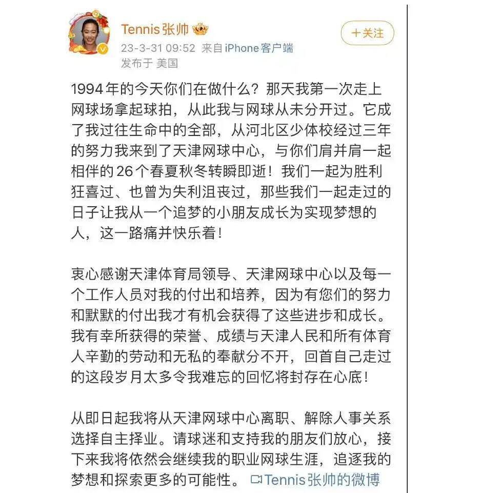2021年全运会,张帅果断选择了退出。两年后的2023年,她更是在海外发布了一则离职声明,宣布与天津网协解除一切人事关系,彻底转为职业选手。在声明中,张帅仍表达了对天津体育局和天津网球中心的感谢:“衷心感谢天津体育局领导、天津网球中心,以及每一个工作人员对我的付出和培养,因为有您们的努力和默默的付出,我才有机会获得了这些进步和成长。”
