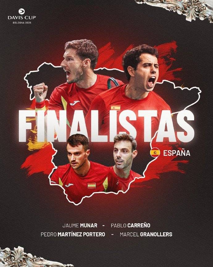 而西班牙队则是时隔6年再进戴维斯杯决赛,将与卫冕冠军意大利队争夺今年的冠军奖杯,三场的比分:布斯塔 6-4 7-6(6) 斯特鲁夫、穆纳尔 6-7(2) 6-7(5) 兹维列夫、格拉诺勒斯/马丁内斯 6-2 3-6 6-3 克拉维茨/普埃茨。尽管西班牙队和意大利队的第一主力阿尔卡拉斯和辛纳都没有参赛,但最终的决赛还是在这两个国家之间进行,只可惜球迷期盼的“阿辛决”无缘再次上演。