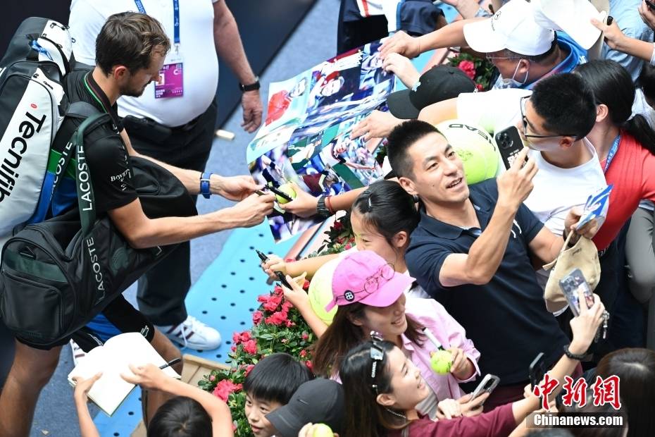 9月29日,2023年中国网球公开赛在北京继续男单首轮较量,赛会2号种子俄罗斯选手梅德韦杰夫以6比2、6比1击败美国选手保罗,晋级中网男单次轮,取得本赛季硬地第39胜。图为获胜后梅德韦杰夫为球迷签名。中新社记者 田雨昊 摄返回搜狐,查看更多
